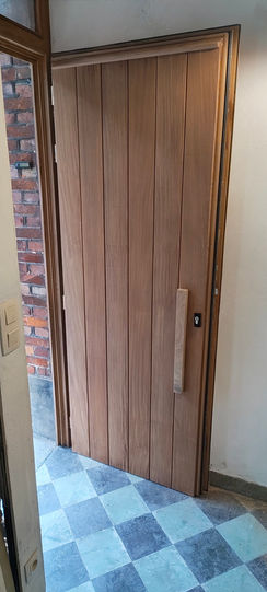 We mochten voor deze klant een houten buitendeur voorzien met een uitgesproken voorkeur voor natuurlijke vergrijzing en een elegante houttekening. Daarom kozen we voor afromosia, een uitzonderlijk sterke en duurzame houtsoort die bekendstaat om haar prachtige structuur en lange levensduur.